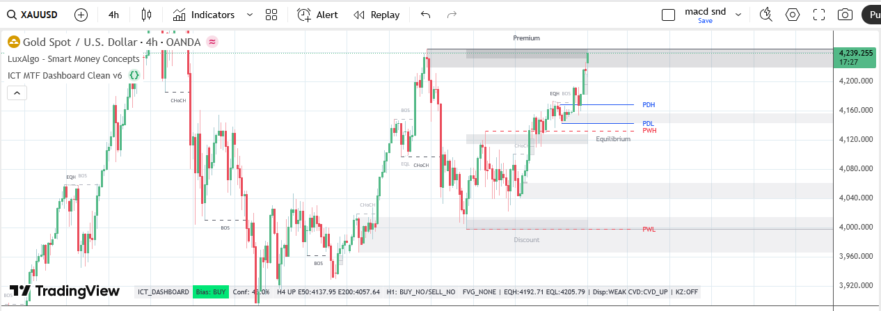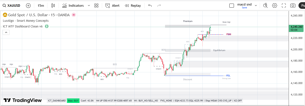 Hari ini emas bergerak di level yang sangat tinggi, berada di Premium Zone semua timeframe utama (H4–H1–M15).